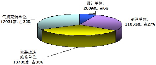 我國現(xiàn)有特種設(shè)備生產(chǎn)(含設(shè)計、制造、安裝、改造、維修、氣瓶充裝)單位4.03萬家,比2006年增加6%。其中,設(shè)計單位2609家,制造單位11034家,安裝改造維修單位13705家,氣瓶充裝單位12934家。