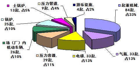 1. 起重機(jī)械、電梯、氣瓶事故仍呈高發(fā)態(tài)勢。在256起事故中,起重機(jī)械事故84起,氣瓶事故33起,電梯事故33起,占總數(shù)的58. 6%。另外,發(fā)生壓力容器事故29起,場(廠)內(nèi)機(jī)動車輛事故26起,鍋爐事故25起,土鍋爐事故13起,壓力管道事故9起,游樂設(shè)施事故4起。客運索道未發(fā)生事故。