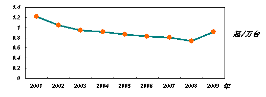 以實際在用特種設備數量計,2009年萬臺設備事故起數為0.92起,萬臺設備死亡人數為0.76人,與2008年同期相比,萬臺設備事故起數增加24.3%、萬臺設備死亡人數下降7.3%,死亡人數控制在國務院安委會下達的特種設備安全生產控制指標之內。