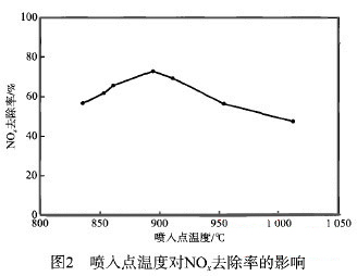 在氨水質量分數為13.0%、噴人點溫度為894℃、霧化壓力為0.35 MPa的條件下,n(NH ):n(NOx)對NOx去除率的影響見圖3。由圖3可見,隨即(NH3): (NOx)的增加,NO 去除率逐漸增加。這是因為隨n(NH3):n(NOx)的增加,有更多的還原NNH3可以與NO反應,NOx去除率增加;繼續增加n(NH ):n(NOx),N0x去除率增加緩慢,這是因為煙氣中大部分NO已被還原,反應物NO濃度降低,反應速率變慢。因此,綜合考慮經濟因素,試驗選擇n(NH3):n(N0x)為1.2。