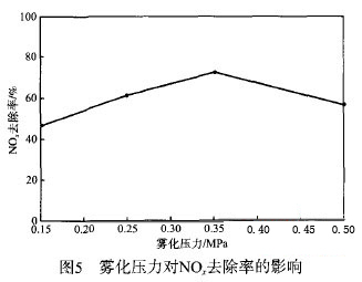 在氨水質量分數為13.0%、噴人點溫度為894℃、n(NH3):n(NOx)為1.2的條件下,霧化壓力對NOx去除率的影響見圖5。