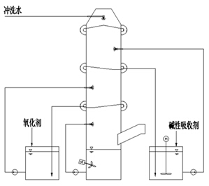 由引風機將煙氣輸送至多級噴霧高效吸收塔內(nèi),由隔膜計量泵將氧化劑溶液輸送至脫硝循環(huán)箱,通過高效噴霧使塔體內(nèi)氧化劑溶液和氣體之間充分地接觸,對污染氣體中的NO進行氧化,然后由堿性吸收劑進行吸收,最終形成硫酸鹽和硝酸鹽。漿液達到一定濃度后,排出吸收塔系統(tǒng),降溫而自然結(jié)晶形成沉淀,固體副產(chǎn)品經(jīng)脫水、干燥排出系統(tǒng)。完成凈化的氣體經(jīng)由除霧器離開吸收塔,進入煙囪排出。
