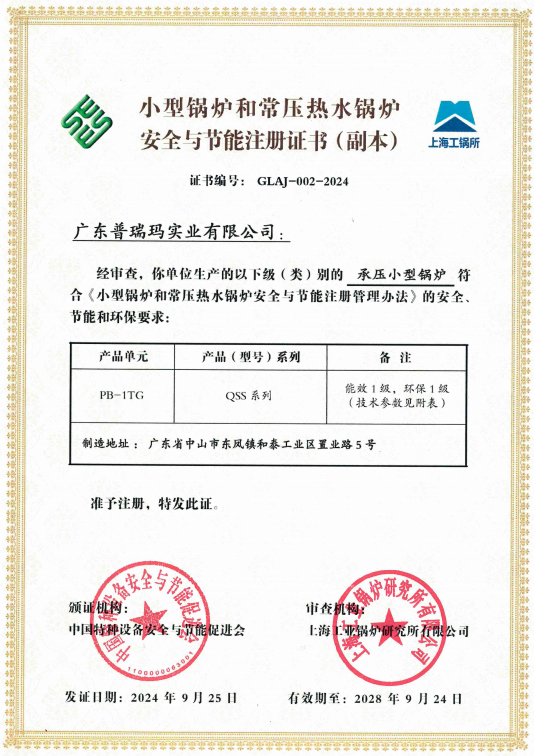 經過專家團隊的嚴格評審,普瑞瑪的蒸汽爐產品榮獲了《小型鍋爐和常壓鍋爐安全與節能注冊證書》。